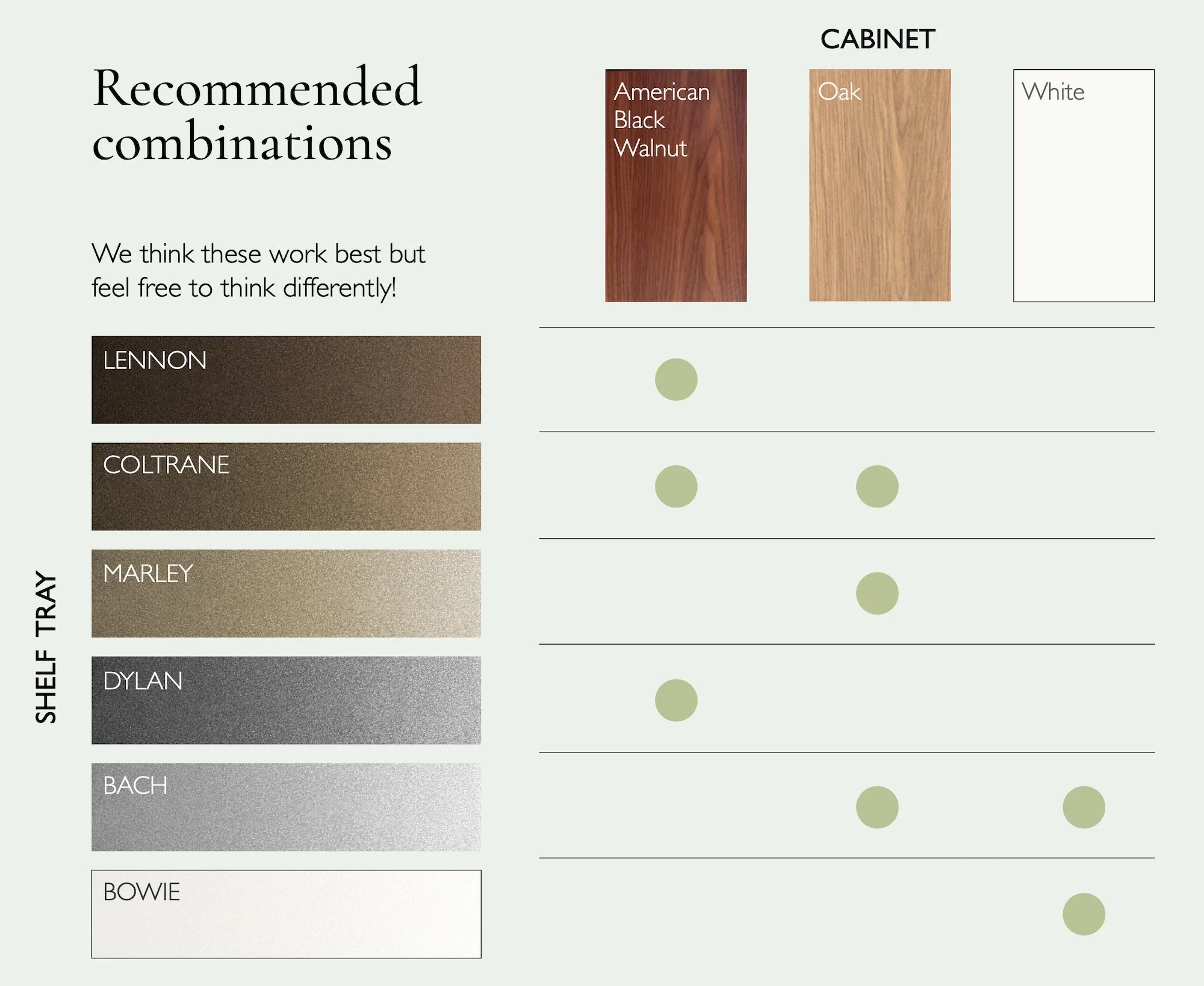Fancy another wood veneer or paint colour for your cabinet? Or another powder coat colour for your trays in any RAL colour you like? Go wild! Talk with us and we’ll provide you with a quote. Please note that special finishes (especially for veneers) will extend the delivery time.