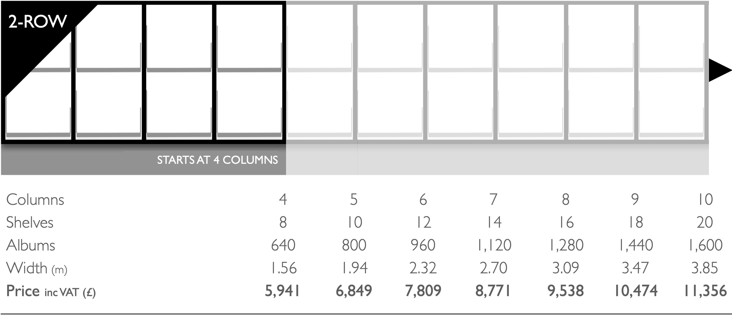 Call for prices for: 5-row height configurations; configuration beyond 10 columns; replacing extending shelves with static shelves; design and build of entire vinyl library rooms